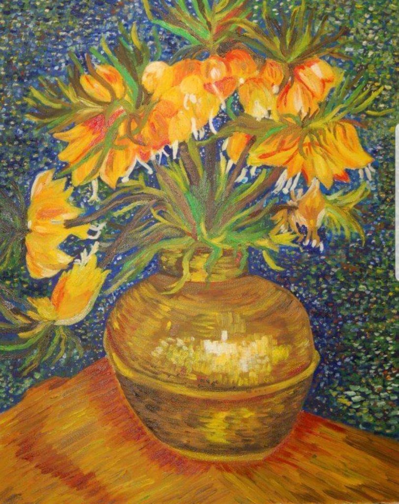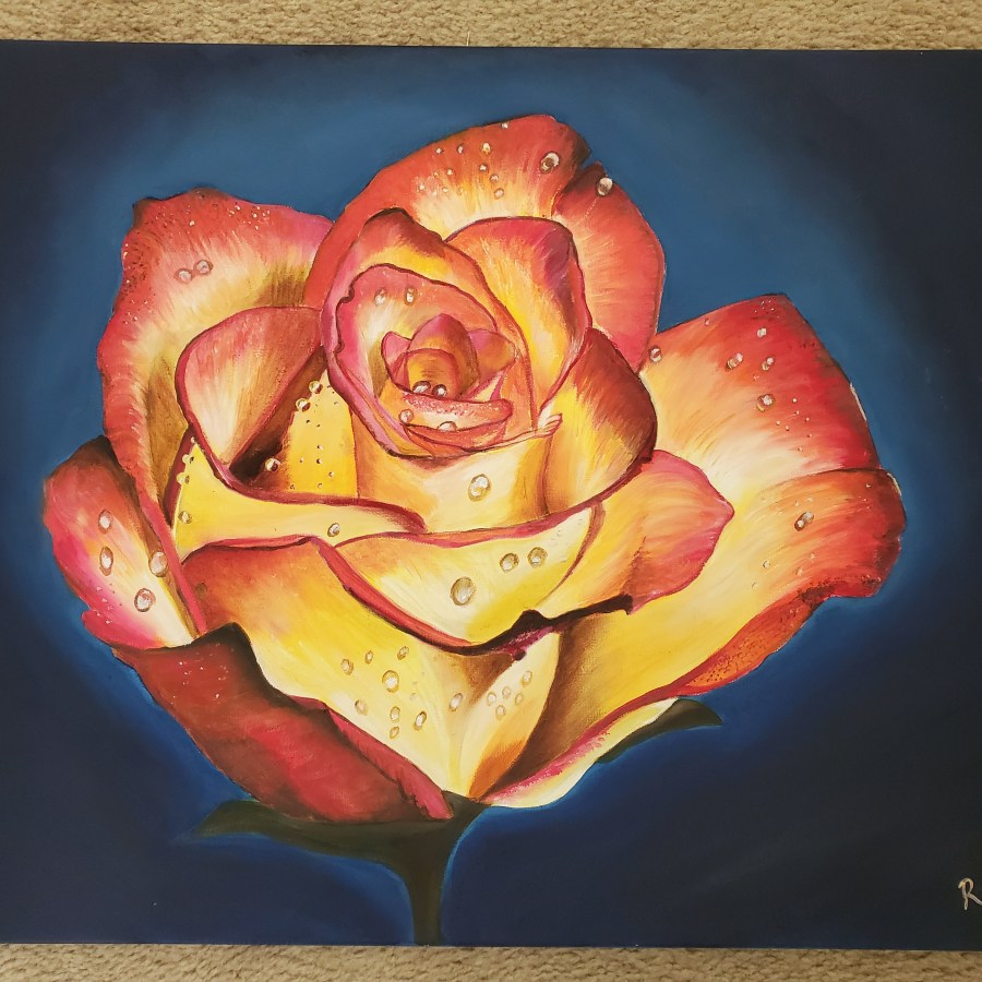 A bold and vibrant rose painted with oil paints on a 18″x24″ canvas