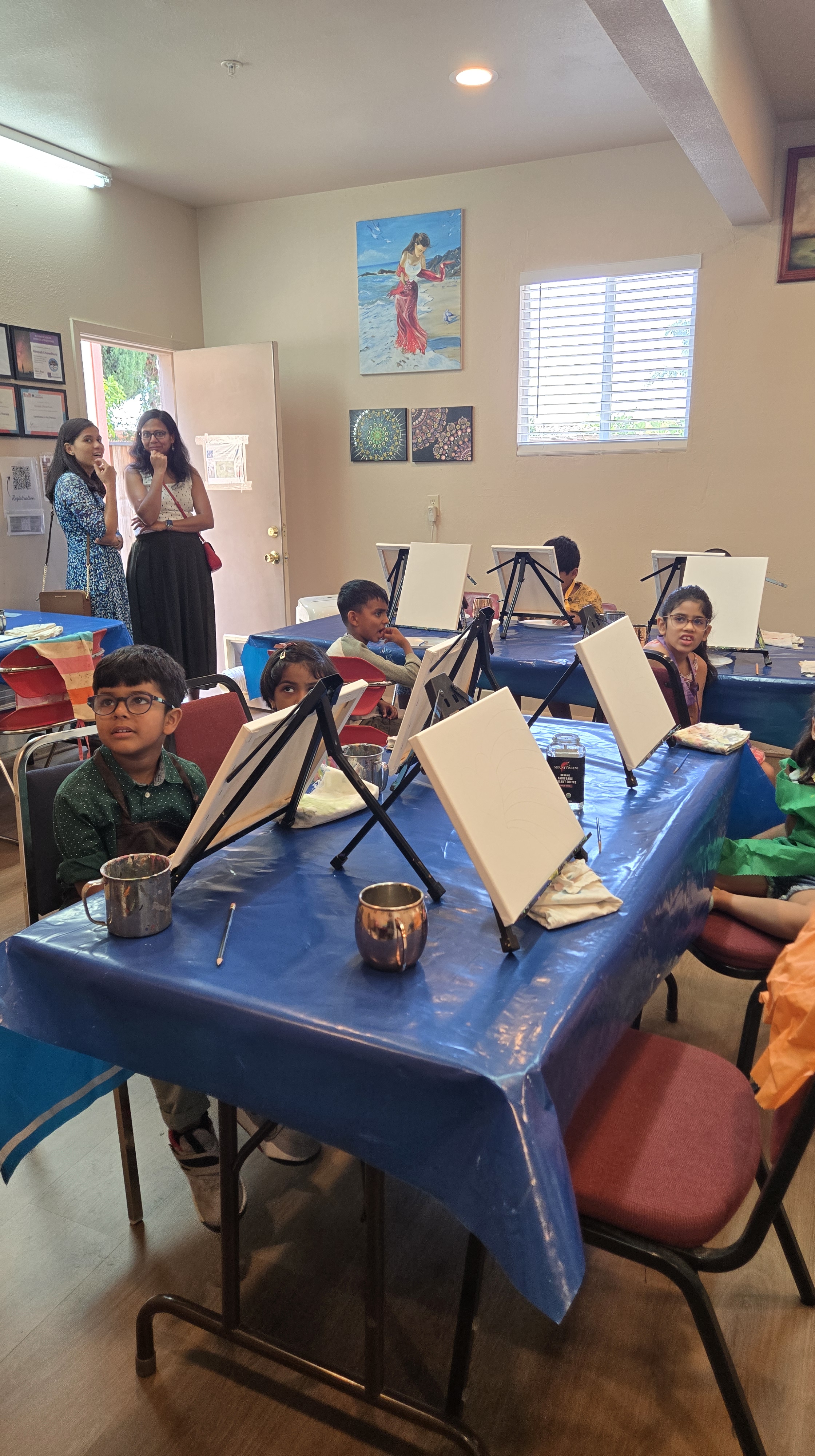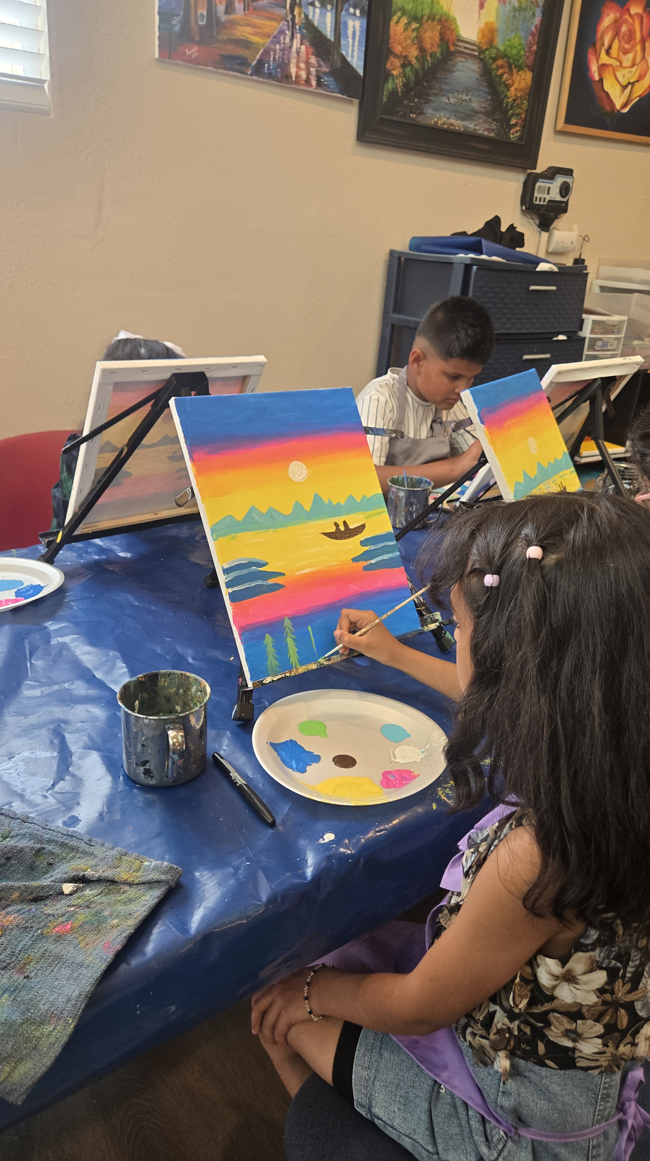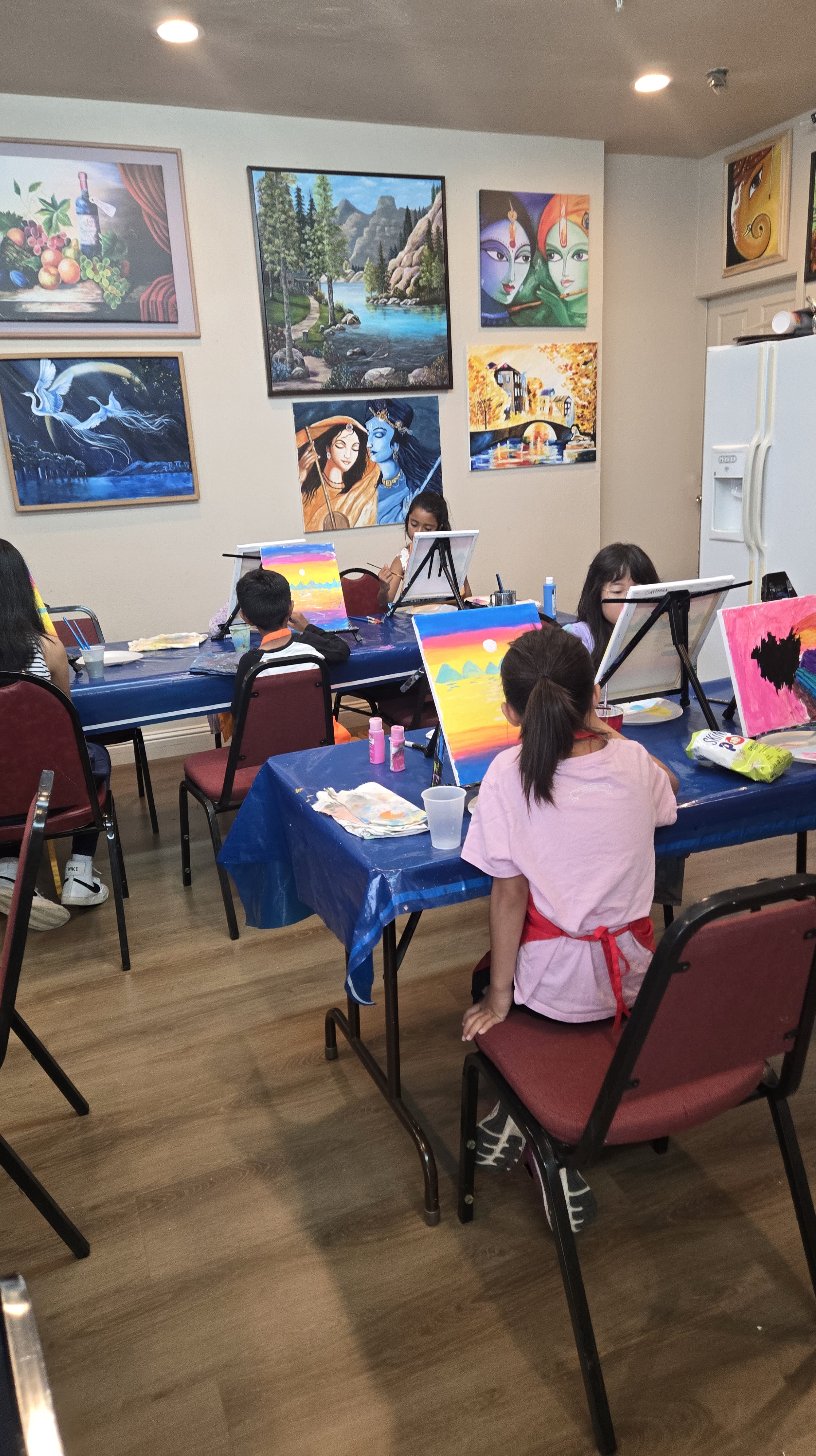 | For kids: Birthday party events last approximately 2.5 hours (including setup and cleanup). We provide all painting materials: Canvases Easels Paintbrushes & paints Aprons Palettes Water cups You’ll just need to arrange tables and chairs for the kids. | When you host the party at our studio, we’ll take care of tables and chairs setup. You’re welcome to bring food for both kids and parents. |