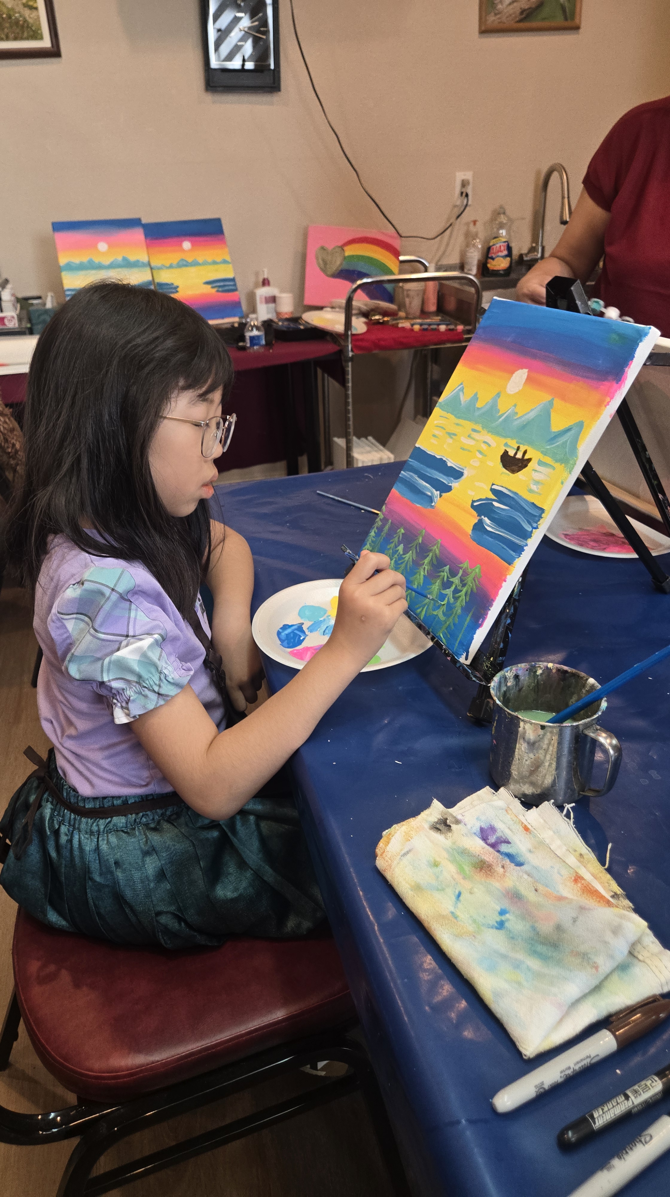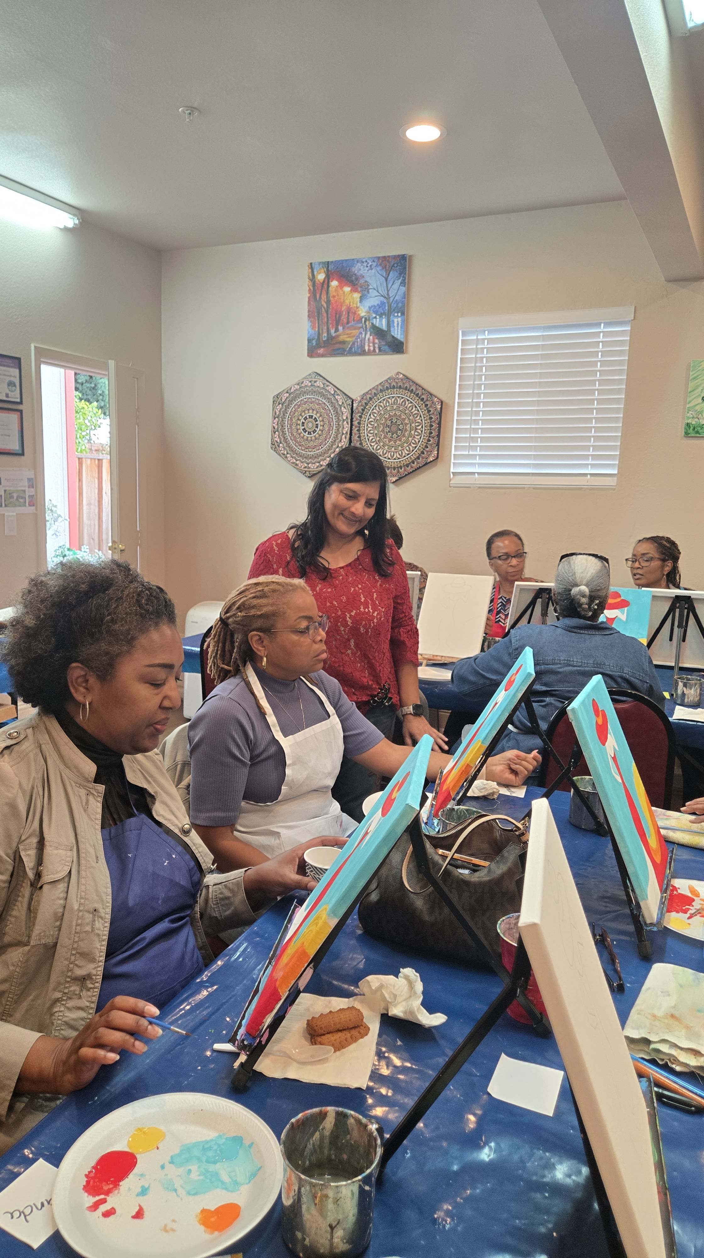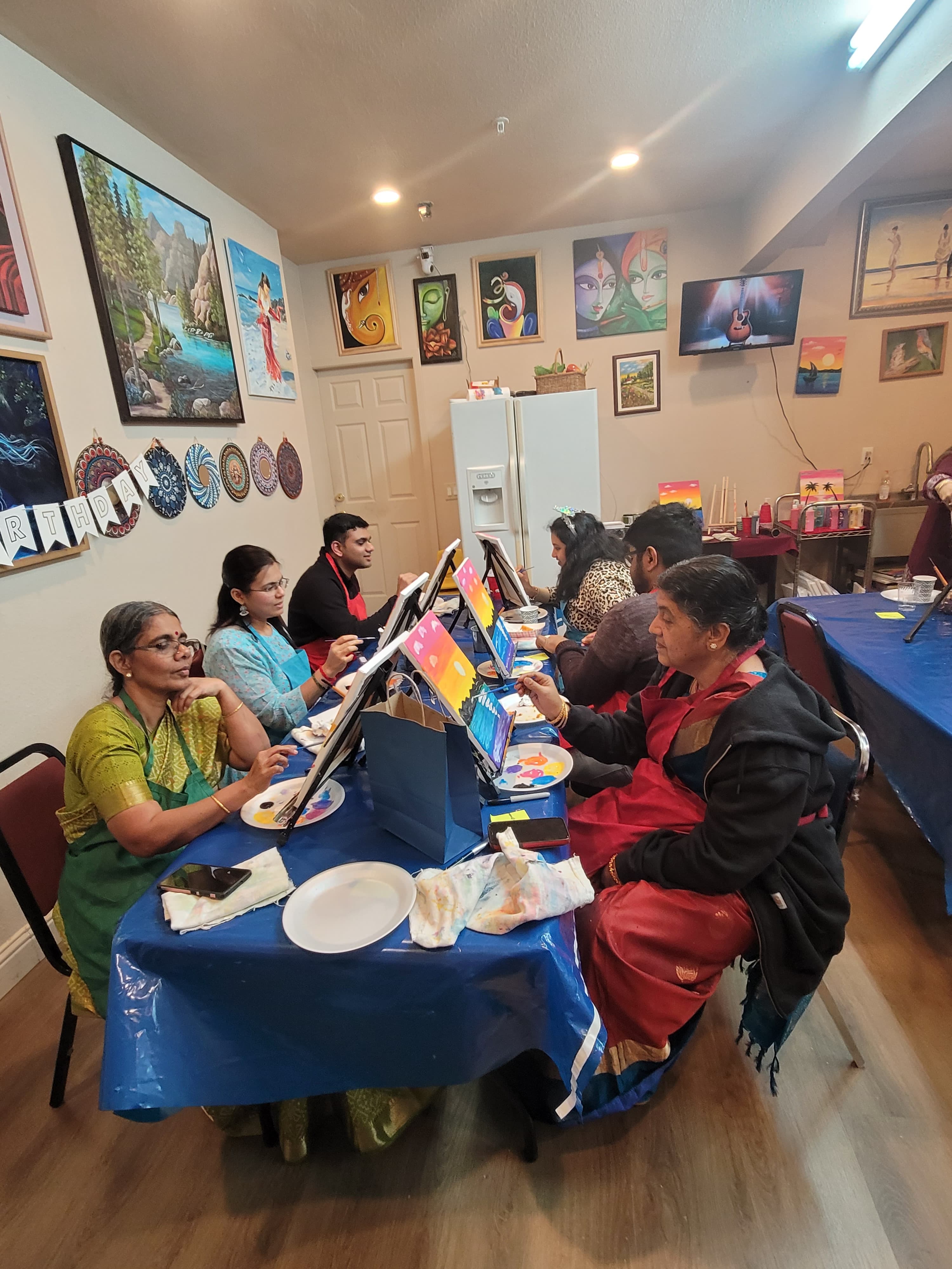 | For kids: Birthday party events last approximately 2.5 hours (including setup and cleanup). We provide all painting materials: Canvases Easels Paintbrushes & paints Aprons Palettes Water cups You’ll just need to arrange tables and chairs for the kids. | When you host the party at our studio, we’ll take care of tables and chairs setup. You’re welcome to bring food for both kids and parents. |