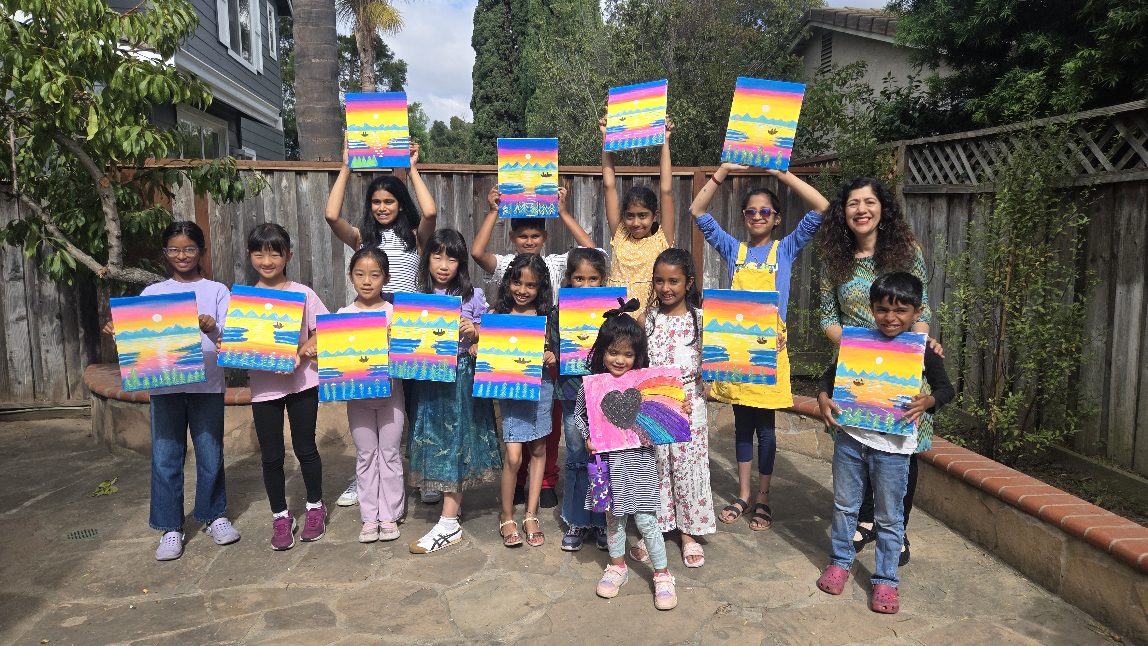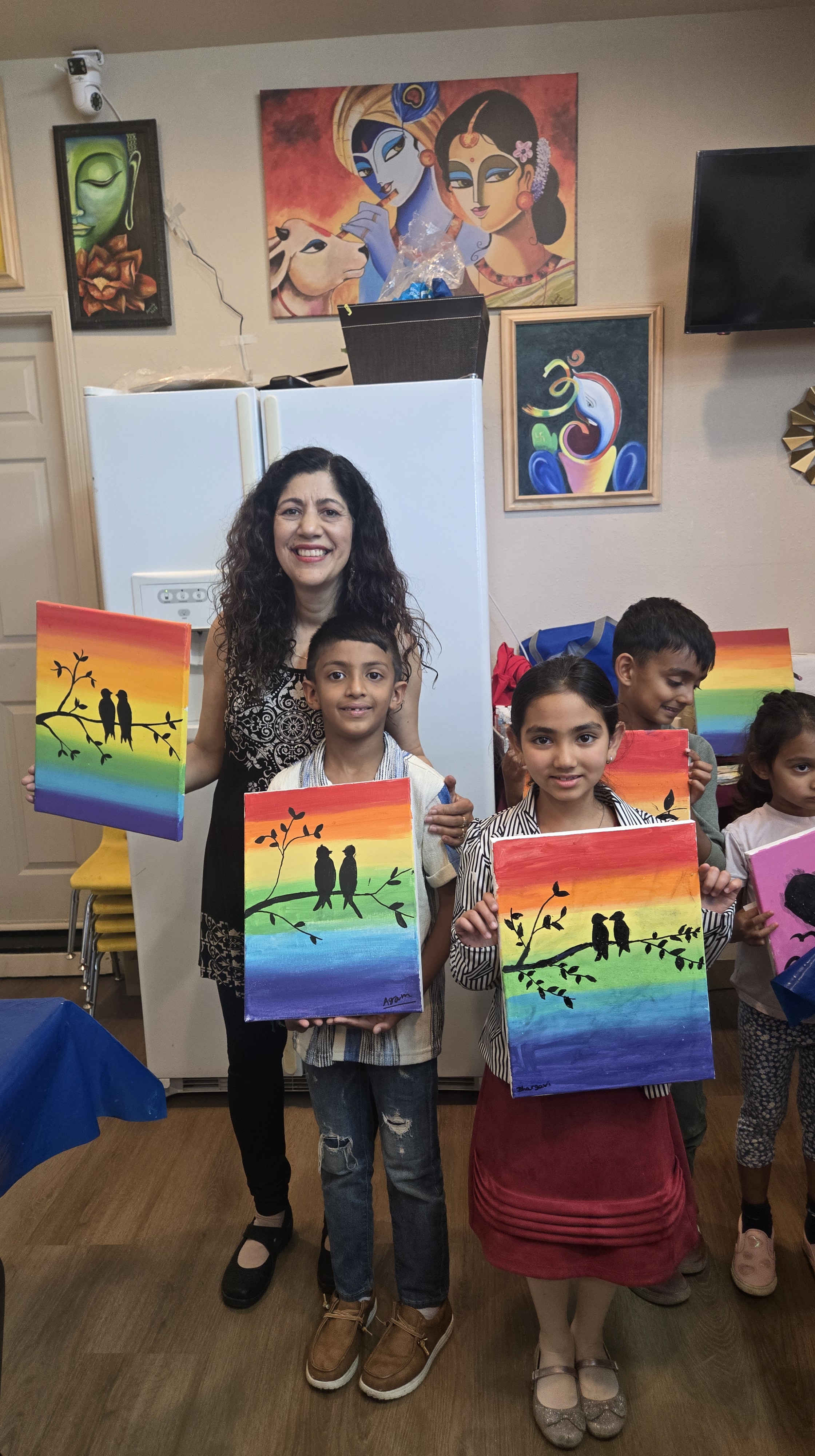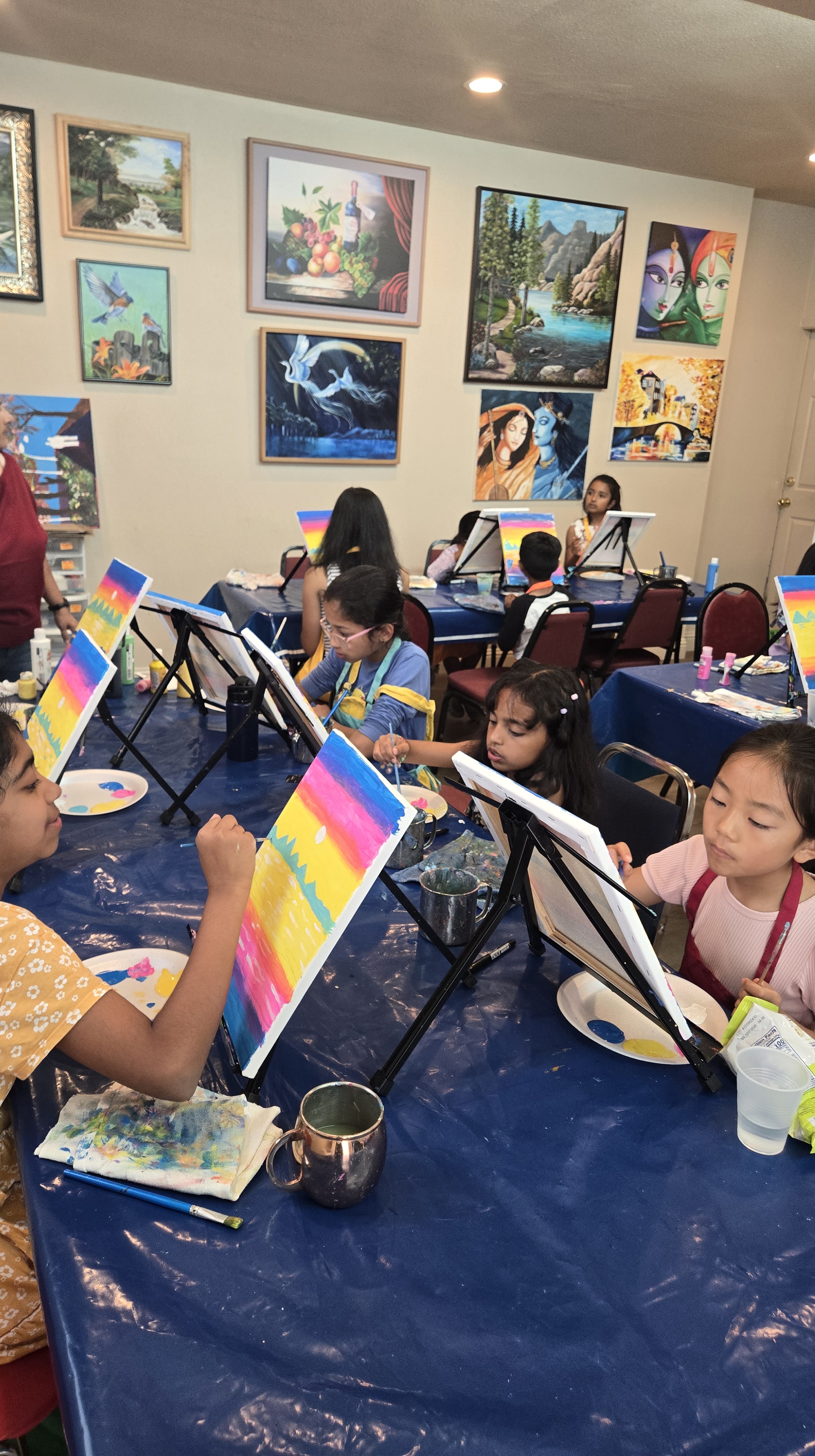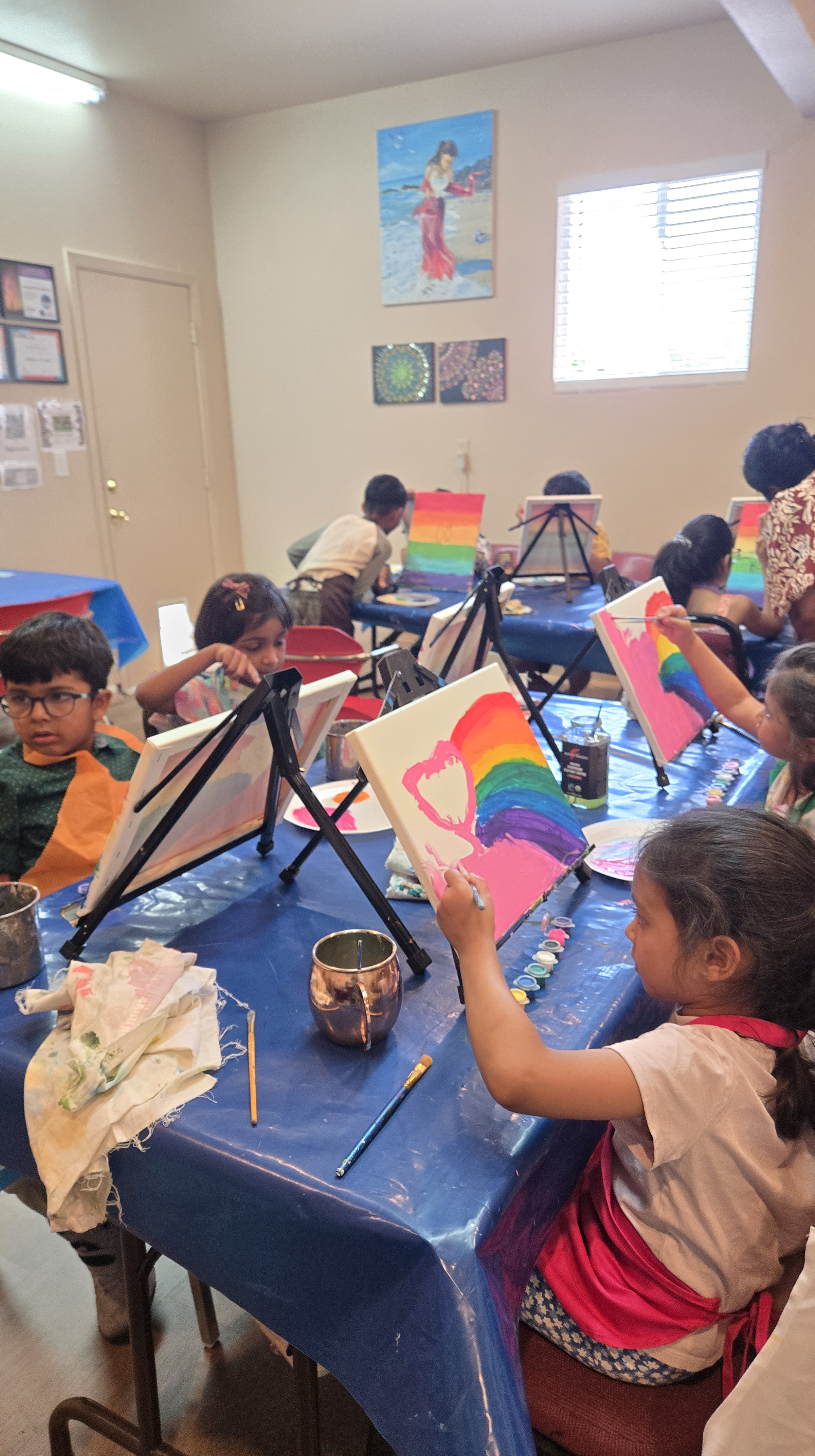 | Pricing: $475 for up to 10 kids $35 for each additional child A conveyance fee applies for locations outside Fremont/Newark (based on distance). Charges may vary depending on the age of the kids and the complexity of the painting. We can also provide a covered area with a complete setup of tables and chairs for the guests and parents at an additional cost of $100. | Pricing:$475 for up to 10 kids $35 for each additional (Same as at your venue) Charges may vary depending on the age of the kids and the complexity of the painting. You’re also welcome to visit our studio in advance to explore logistics and discuss creative ideas for your paint party. |
